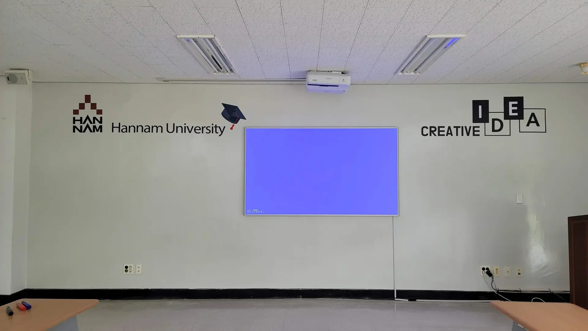 At Hannam University in Daejeon, an old classroom featured outdated whiteboards and a recessed, motorized projection screen. Many lectures involved the use of projected materials, but lowering the screen blocked half the available writing surface. Additionally, turning off the lights made it nearly impossible to combine analog writing and digital content simultaneously.