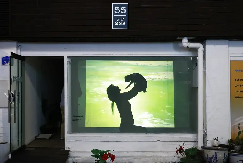 For this exhibition, the artist purchased and applied Rear Projection Screen Paint directly onto the glass surface. By utilizing an already owned projector, she minimized additional hardware installation costs while transforming the glass window into a projection screen that expanded the exhibition space and integrated visitors’ movements into the display. Typically, media art exhibitions require large LED screens or expensive digital equipment. However, this case demonstrated that a simple glass window and a projector alone could create a high-quality exhibition.